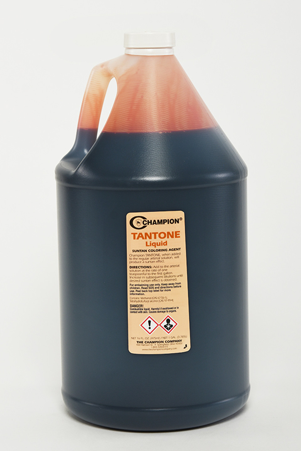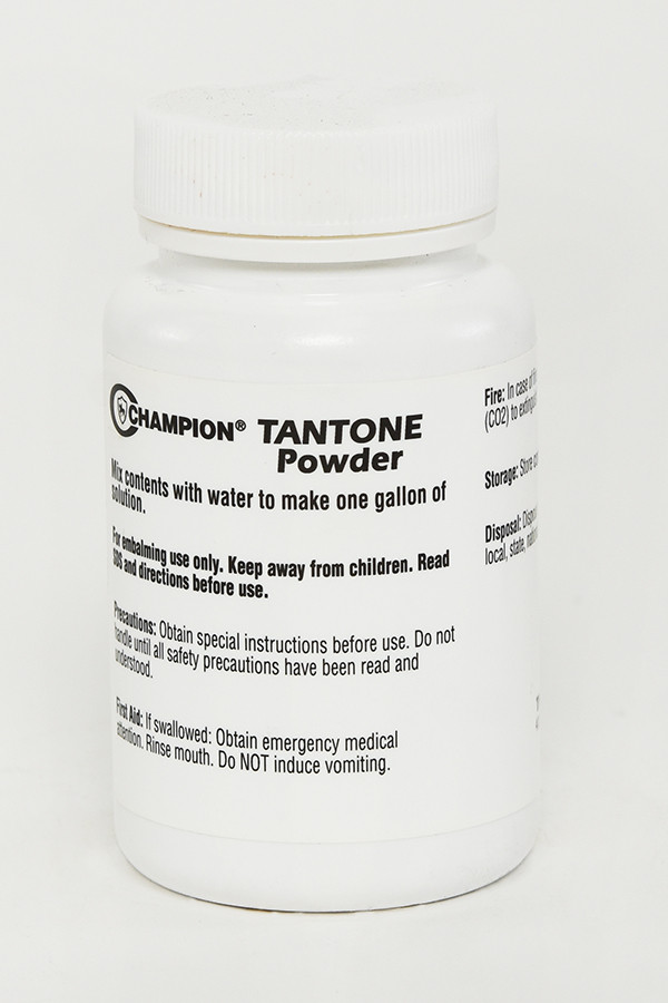 TANTONE Is designed especially for use with Champion TNX Arterial Fluid. Tantone contains coloring ingredients that range from brilliant scarlet to brown so that a ruddy or suntan effect is produced. AVAILABLE IN 16 OZ. BOTTLE, 1 GALLON JUG, OR PLASTIC VIAL (MAKES 1 GALLON).