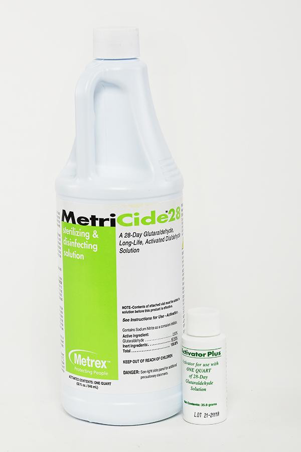 A 2.5% glutaraldehyde based high-level disinfectant and cold chemical sterilant. After activation the solution has a 28-day activity and can be reused during that time. It meets all criteria for high-level disinfection and sterilization if label directions are followed. Metricide 28 has a broad-spectrum activity against viruses, bacteria, molds, fungi and other vegetative organisms. It is easy to use and activate. Metricide 28 is recommended for instrument disinfection in the embalming room or any area where very high-level disinfection is needed