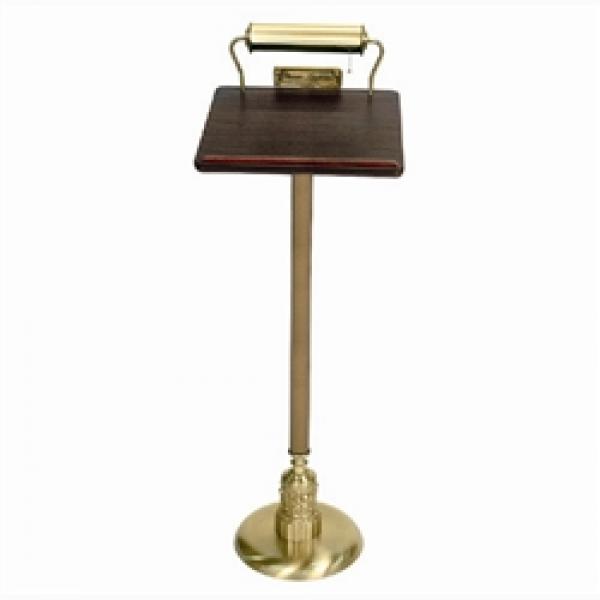 Walnut finished veneer with 2 card pockets on each side. Lightweight with concealed wheels. Reflector lamp has hidden wire. Features a pull out drawer.