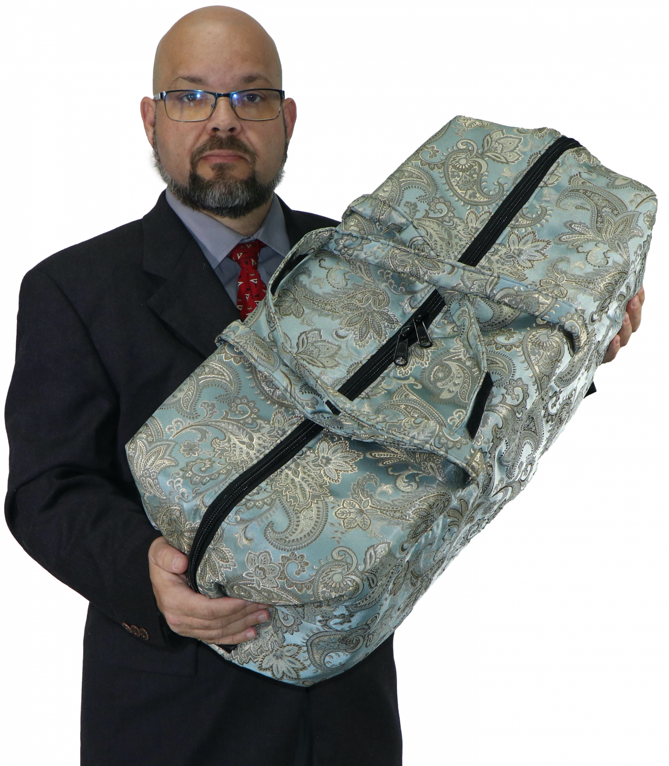 Precious Cargo Transporter Plus, is designed to carry your most vulnerable cases in a more dignified manner. Typical toolbox carriers shelter the remains in an industrial container, carried at knee level. The Precious Cargo Plus wraps the precious remains in a beautiful fabric encased container and is carried in the arms at chest height or over the shoulder, meant to acknowledge the importance of the deceased.