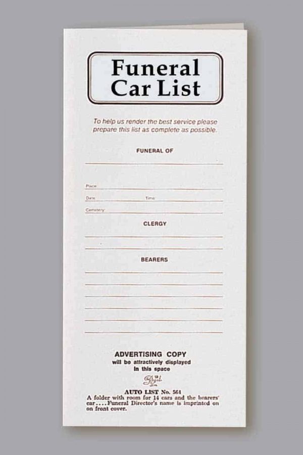 A folder with space for 15 cars plus service data, bearers, and cemetery.