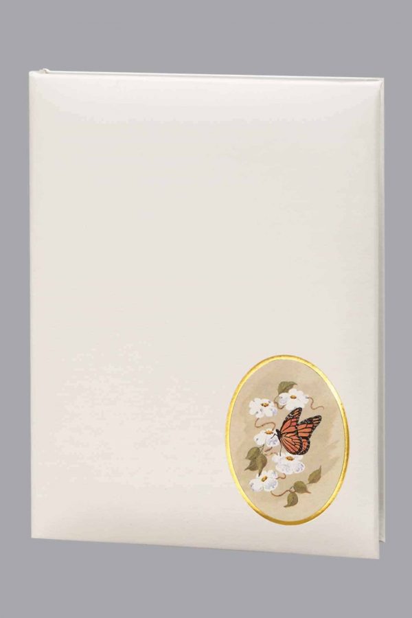 Butterfly Oval Funeral Guest book features a delicate, serene image of a Monarch butterfly landing on petite white flowers on a white cover stock in a style that may remind some of needlepoint or cross stitching work. This would be perfect for a lover of gardening and the outdoors. Butterflies traditionally represent a resurrection, a renewal of hope.