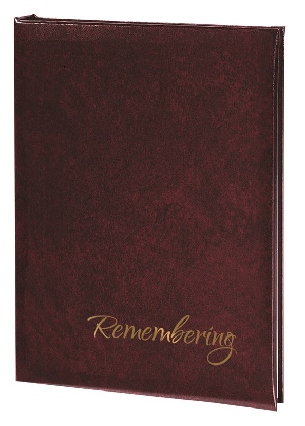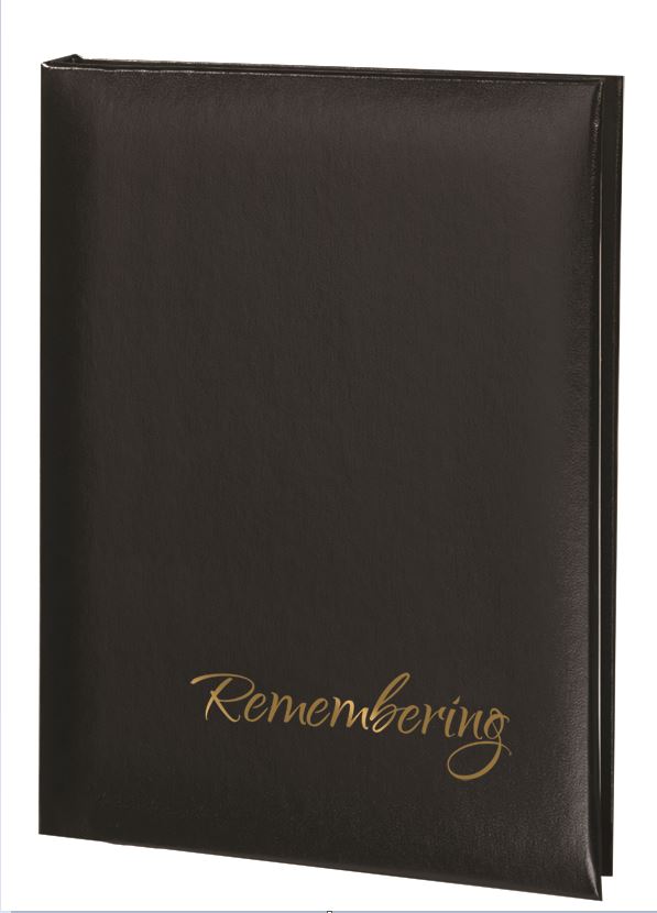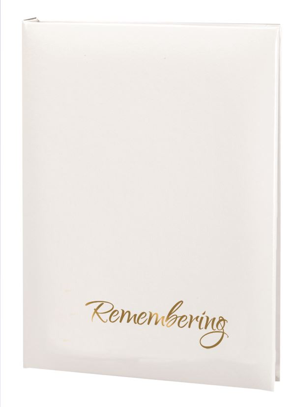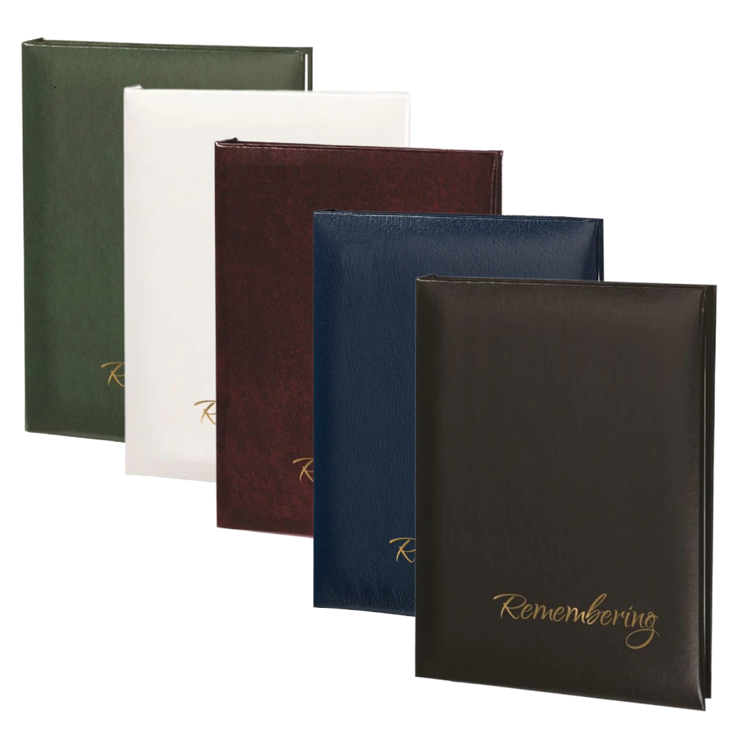 Value Series Funeral Guest Book features a simple and classic design. “Remembering” text is stamped in gold foil. This Value Series Funeral Book is available in a multitude of colors: Black, Burgundy, Green, Navy Blue, and White.