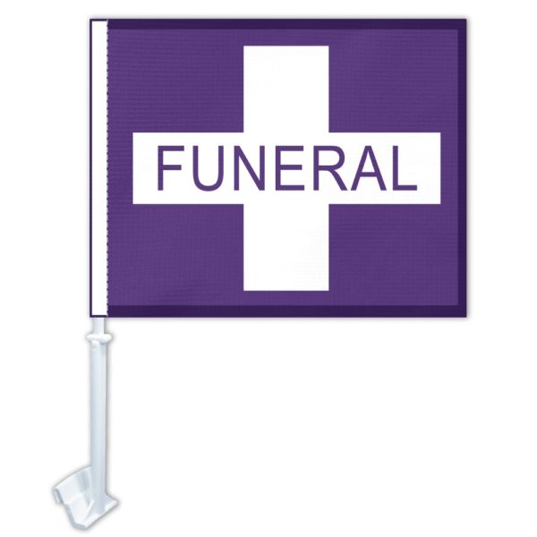 These funeral flags come attached to 20″ plastic flagpoles for window usage.